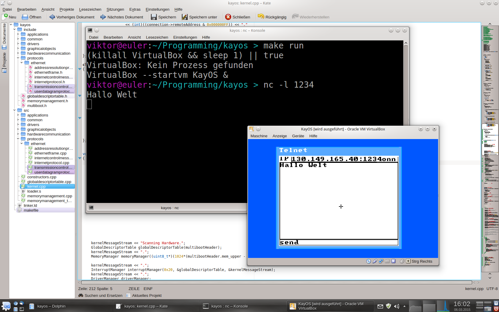 Auf dem Screenshot kann man die TCP/IP Kommunikation sehen - mit dem Telnet Client wurde aus der virtuellen Maschine heraus der Text "Hallo Welt!" an den Server (netcat im listening Mode) geschickt.